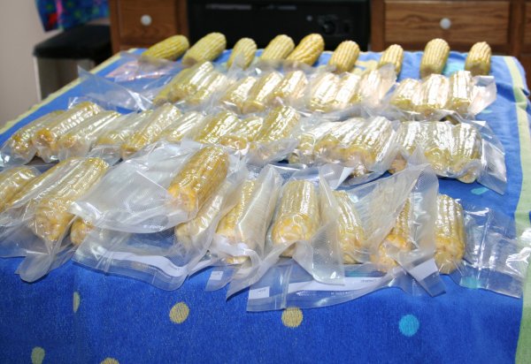 But any time we’ve tried to seal bags where the contents have even the least little bit of moisture, we have trouble getting the bags to seal properly. Yesterday, Dave ended up having to put the bags through at least twice, sometimes three times before he got a good seal. And the unit overheats and needs to be allowed to cool down after only a few seals… so bagging the corn actually took longer than the blanching did.