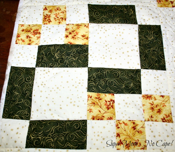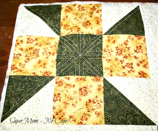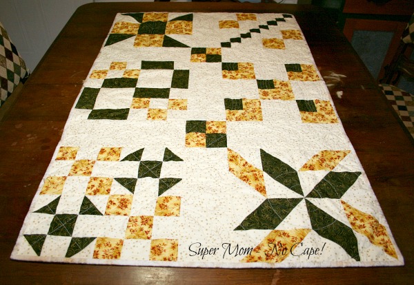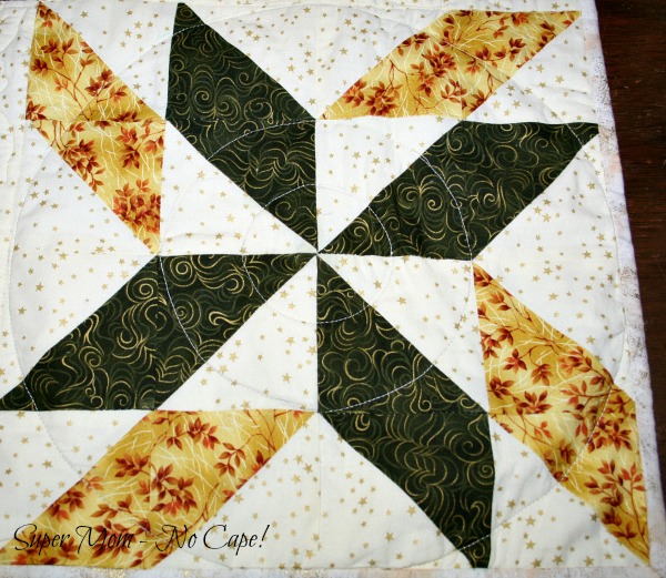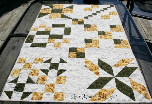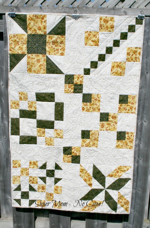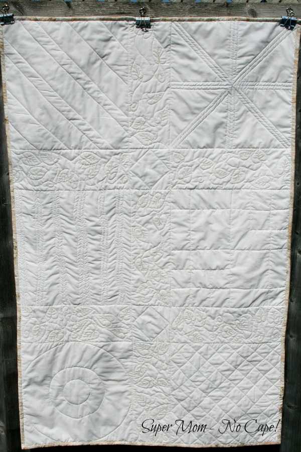 This view of the back really let’s you see the different quilting that I did on each of the blocks and in the sashing.