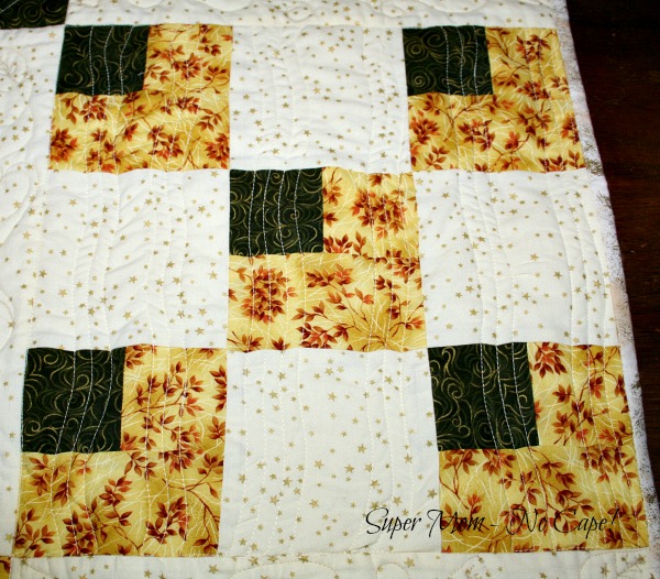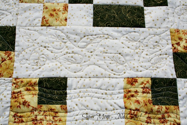 And then finally, here’s a close-up view of the free motion quilted leaves and vines that were done in each of the sashing blocks.
