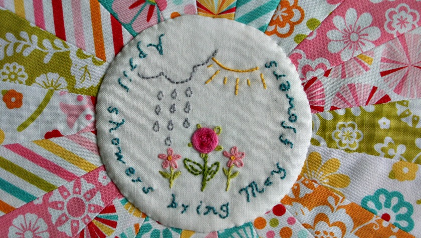 I had the basic idea of what I wanted but it wasn’t until a few days ago when looking at the pretty spring colors in the block that the idea began to gel and the April Shower embroidery pattern came to life.