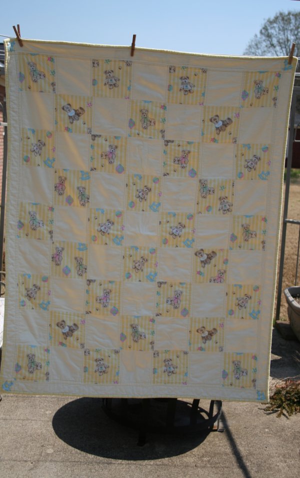 My entry into the Bloggers Quilt Festival would certainly not qualify as the most beautiful or most intricately pieced or the most original. Its design is a simple one; flannel blocks from a bear print that I fussy cut alternating with a coordinating yellow flannel.