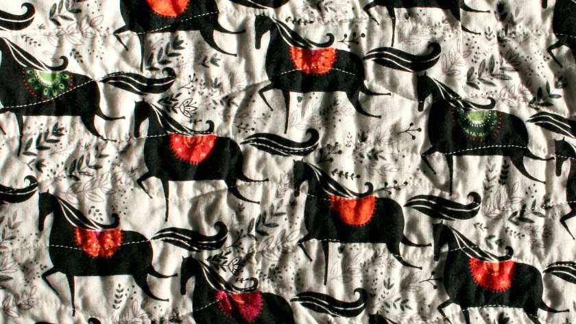 When I bought a half yard of this beautiful horse fabric to make Oldest Daughter’s Christmas gift, I had no intention of making a quilt with it or I would have purchased at least a yard. It is part of the Wild Field line by Dinara Mirtalipova for Windham Fabrics. At first, I thought I would make her a tote…