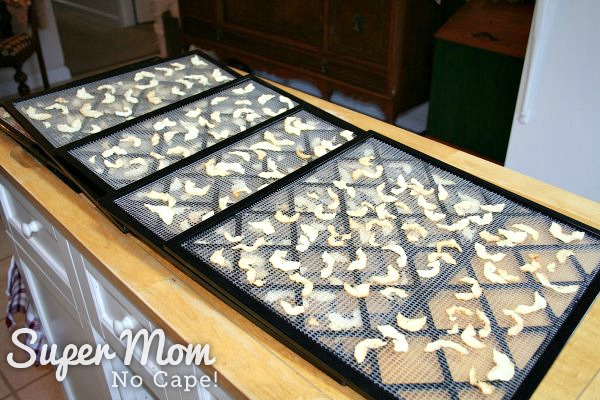 When you’re sure the pears (or apples) are dry, remove the trays from the dehydrator.