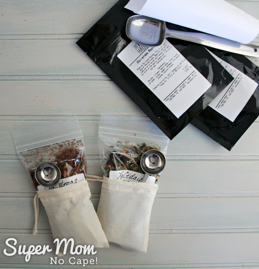 Using the labels, write the name of the tea and stick it to the plastic baggie so that your recipient knows which tea is which. You can put multiple baggies in each tea mug. Once the labels are on the plastic baggies, it’s a simple matter of assembly.  Put the baggie inside a cotton drawstring tea bag with a tea scoop and then pop all into their tea mug.