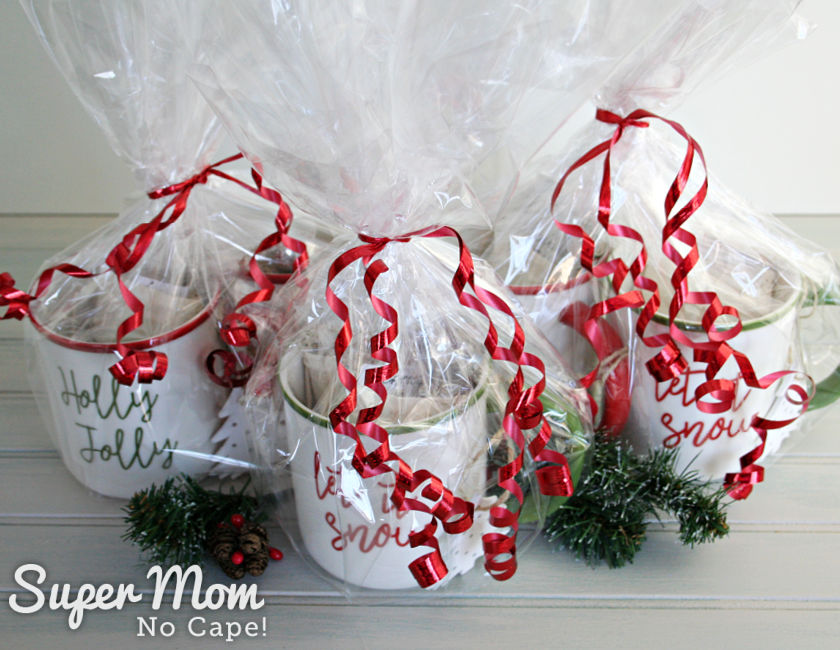 A picture of tea mugs with loose leaf tea in bags inside wrapped in cellophane and tied with decorative ribbon