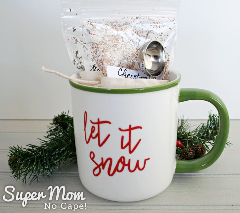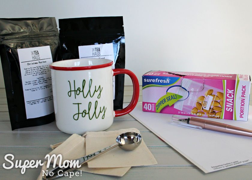 A picture of the materials needed to make the tea mug and loose leaf tea gift.