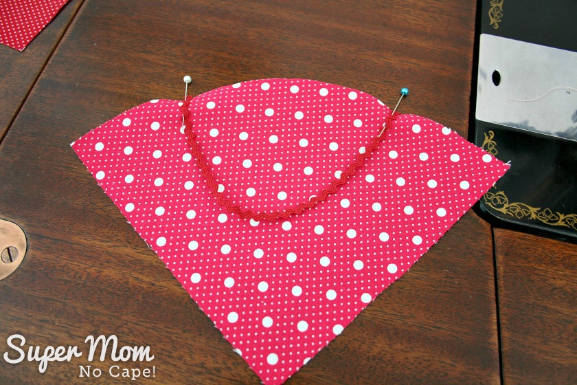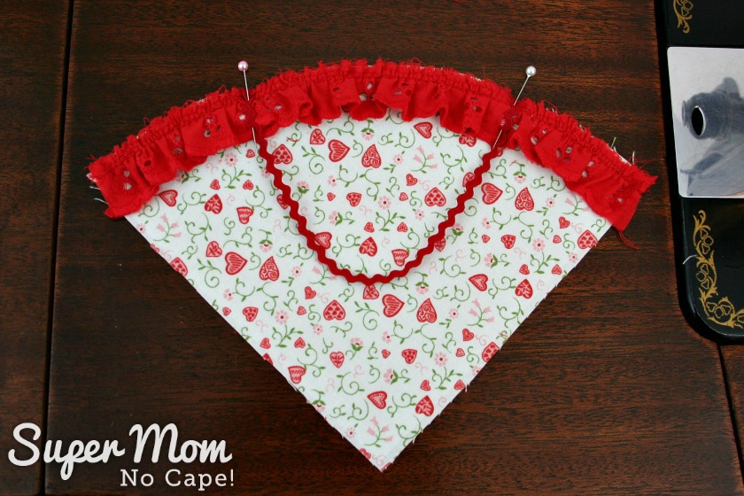 Then pin the ricrac handle over the gathered red eyelet trim or whatever trim you’re using.