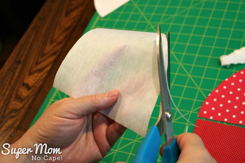 Make sure to place the trim in at least 3/8″ from the long straight on either side to make sure it doesn’t get caught in the seam allowance when you sew the cone together.