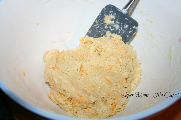 Add ½ c of grated cheese. Mix gently to incorporate the cheese. A fairly sticky ball of dough will form that should look something like this: