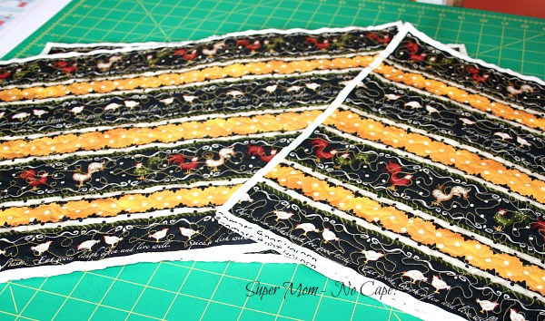 Now all four rooster placemats are quilted, trimmed and ready to have the binding attached.