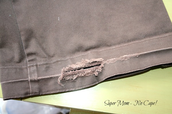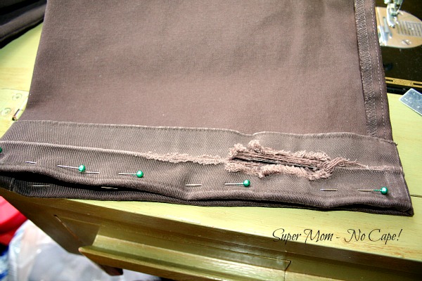 Now because I’m shopping thrift stores, I don’t always get pants that are the correct length so I need to hem them. And as you see in the photo below, the person who owned them before me needed them shorter because the hems are frayed in places and had a crease where they had been cuffed.