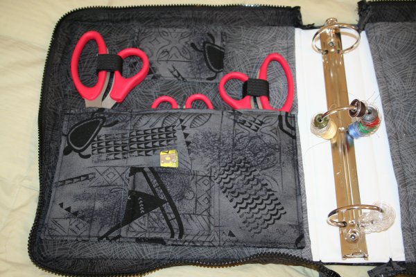 Using scraps of fabric leftover from making my husband an Aloha shirt, I designed and constructed a zippered binder cover with pockets on the inside panels to hold a set of good quality sewing scissors and various other sewing accessories.