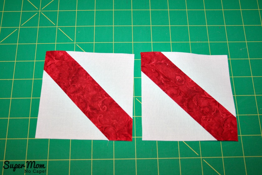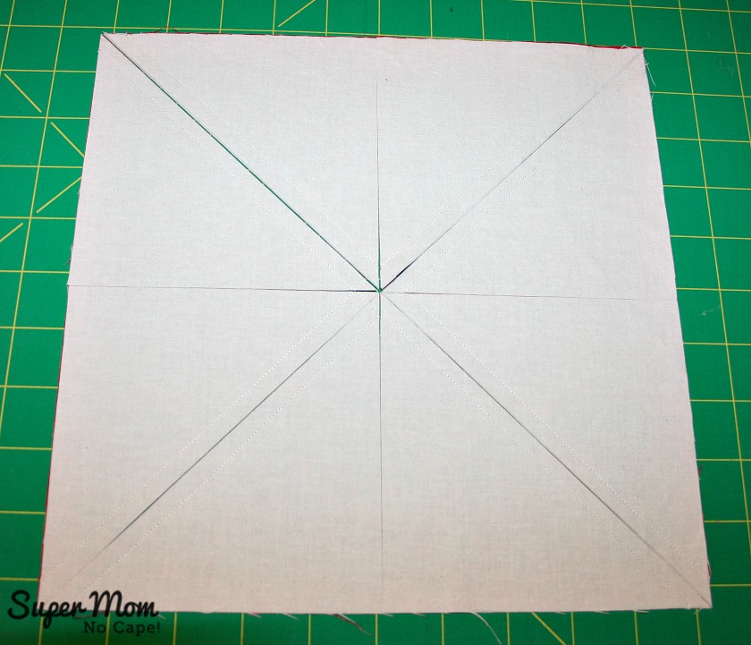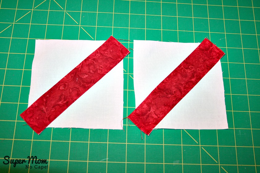 Place the red 10 ¼” square and white 10 ¼” square right sides together. Stitch ¼” seam on either side of each line.