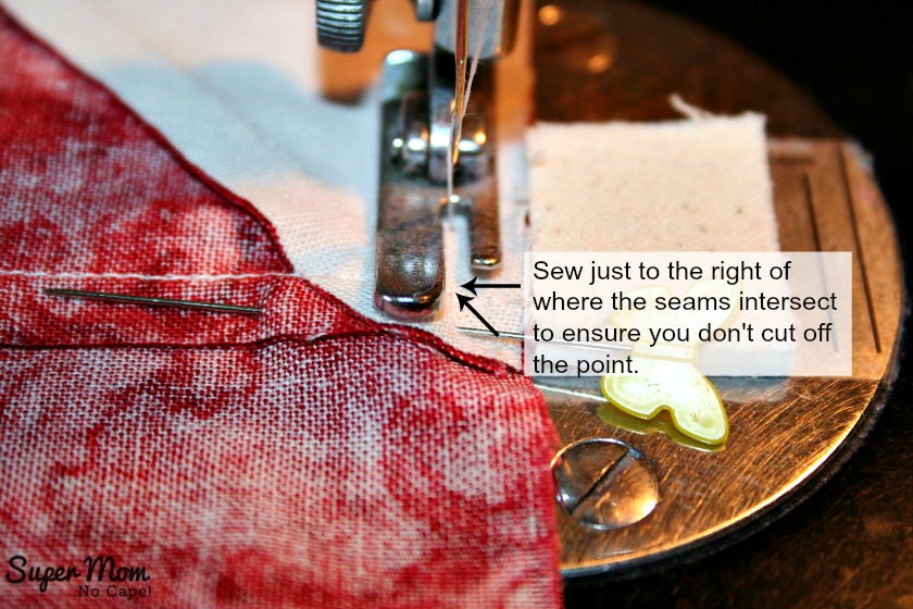 To help make sure you don’t lose the points of the hsts… as you approach the point where the seams intersect (see the arrows,) sew just inside or to the right of that point.