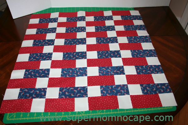 Once I had the four strips sewed together and took a picture of the finished top, my first thought was that it looked a little like someone has taken the American flag, cut it up and sewed it back together all scrambled up, so I’ve decided to call it Old Glory Scrambled.