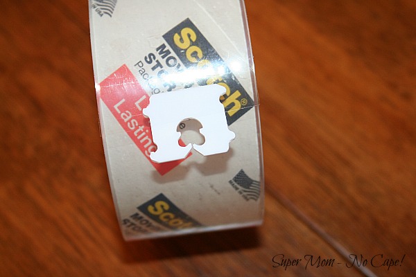 The other day, I was wrapping some packages to get them ready to mail and remembered this little trick I saw for using a plastic bread tab on the end of a roll of packing tape so that you don’t have to search for it each time you want to cut a new piece of tape.
