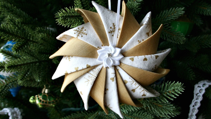For this ornament, I used eight 4.5″ squares of a white cotton with gold snowflakes and eight 4.5″ squares of a gold satiny fabric.