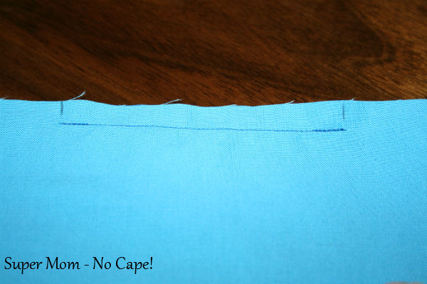With right sides together, sew from the bottom of the casing on one side to the bottom of the casing on the other side, leaving an opening in the bottom of the apron for turning as indicated in photo.
