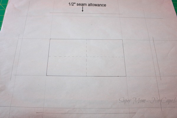 Place your ruler on the line #1 and draw a second line of dashes 2 3/8″ away.  The lines of dashes are the center lines of the top of the tissue box cover pattern. These will be used in the final step of making the pattern.