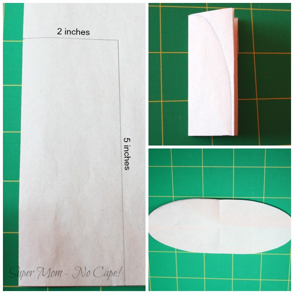 To create the oval for the opening in the top of the tissue box cover, fold a 2”X5” piece of paper in half. Fold it in half again. Draw the desired shape and cut out.