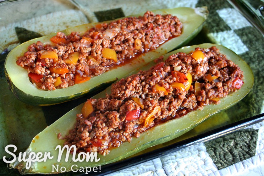 Fill the hollowed out zucchini halves with the sausage meat mixture.