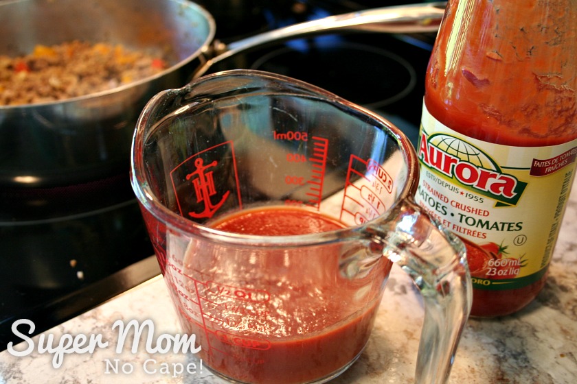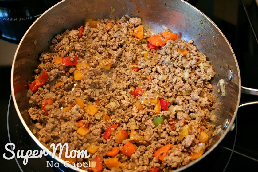 Scramble fry the ground pork (or whatever ground meat you’re using) in a frying pan. Add the spices, onions and peppers.