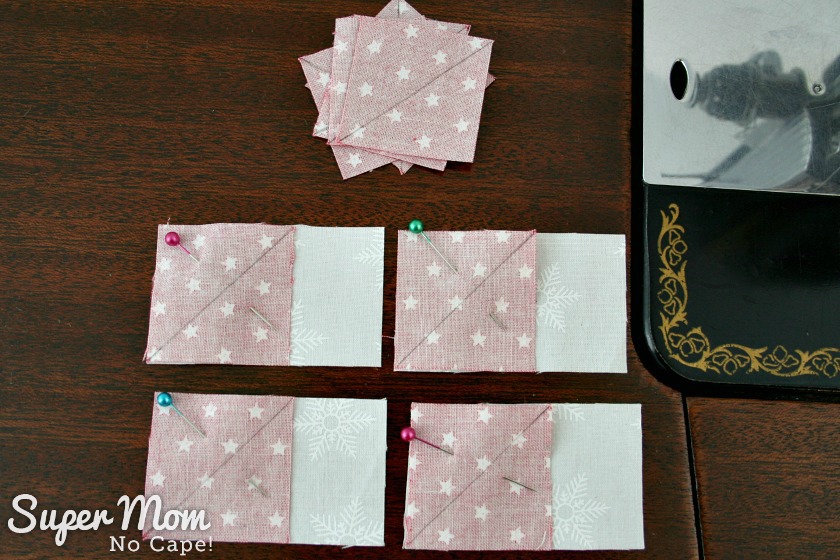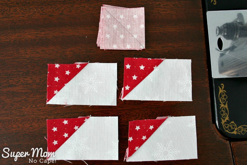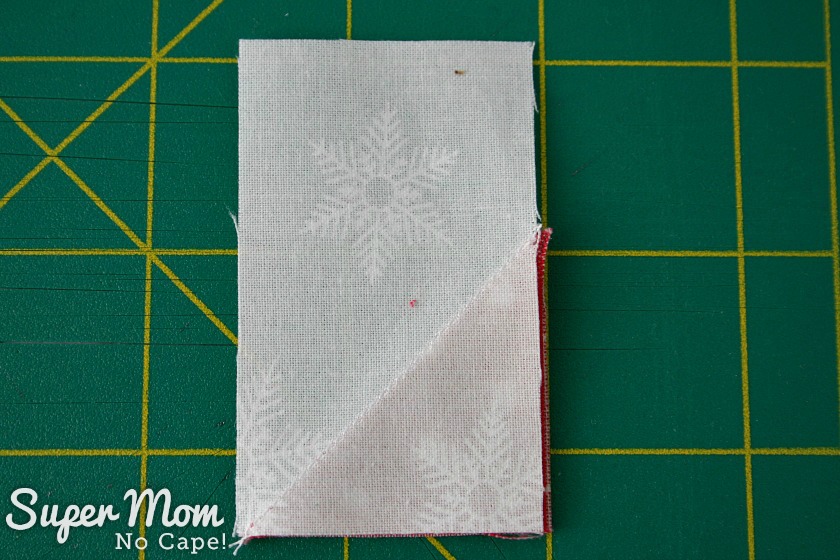 On the wrong side of each of the 1½” red squares draw a diagonal line from one corner to the other.