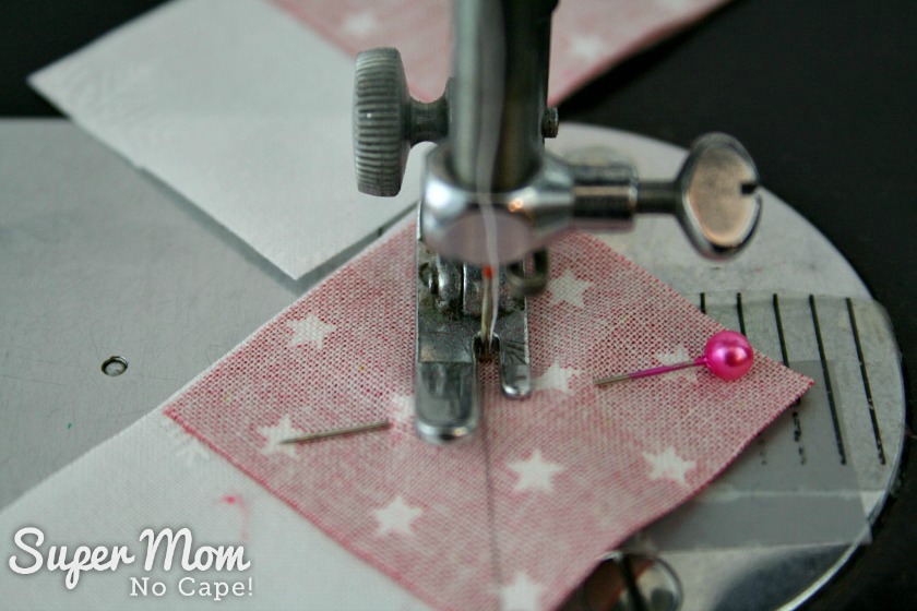 If you stitch directly on the line, when you flip the red triangle up, it won’t be square with the white background fabric.