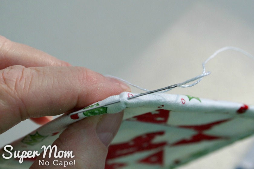 Thread an embroidery needle with #20 Pearl Cotton Thread and add a hanging loop in the top corner of the binding.