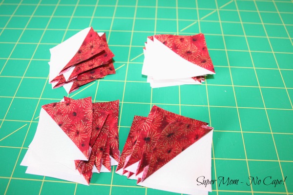 There are 32 little half square triangles in those piles. And when I say little, I mean little. Each was trimmed and squared up to 2” making the finished size of the blocks 1.5”.