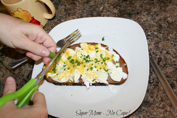 Actually, my tip of the day is to Not chop your chives but to use a pair of kitchen scissors to snip them. It is so much faster and easier just to hold a few chive leaves over whatever it is you want to use them in/on and snip away. And it saves having to get out a knife and the cutting board.