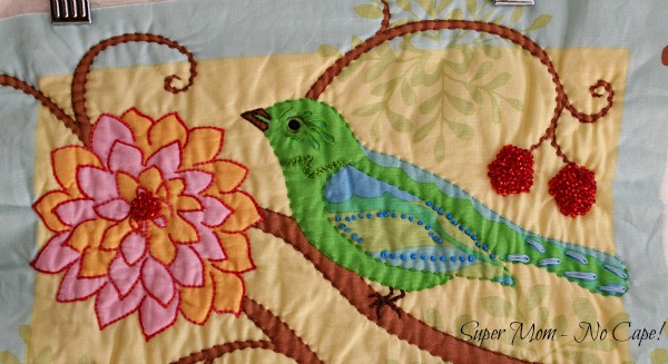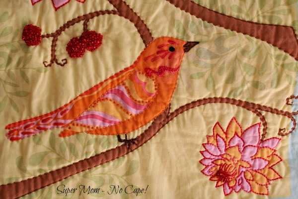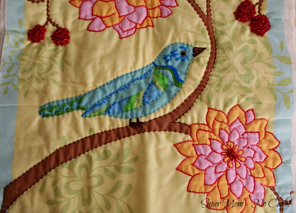 But for things like the details on the birds… the French knots on the wings, the lazy daisy stitches for the tail feathers and around the eyes and the parallel rows of backstitch at the throat, I just embroidered the fabric.