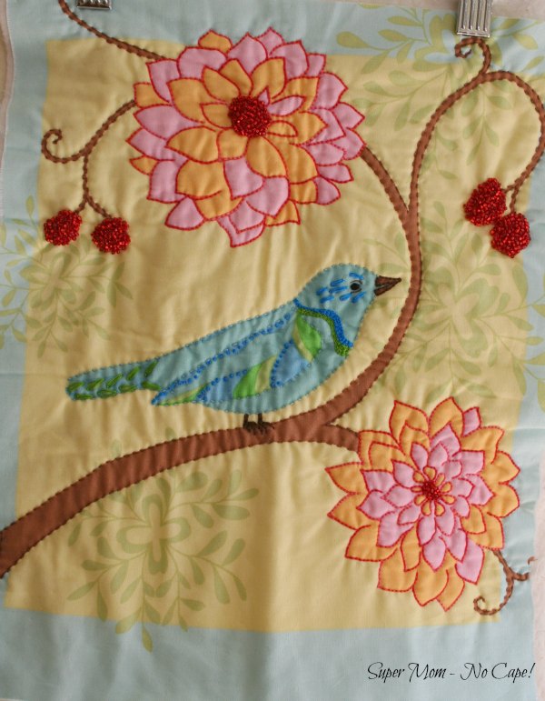 I’ve been working off and on embellishing two fabric bird panels since July of last year. You can follow the progress on these panels by clicking on the embroidery category in my left sidebar.