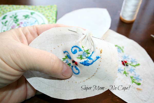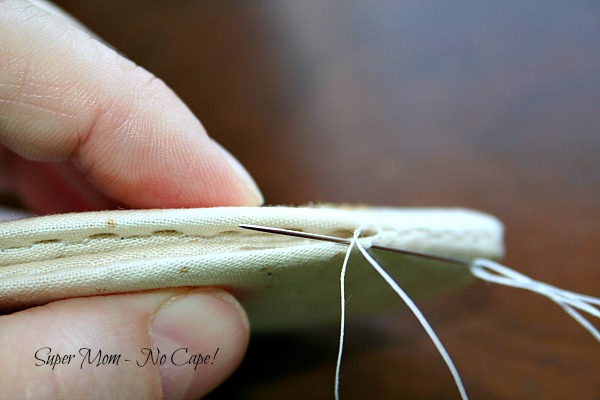 Please note… it is important that you thread the needle with enough thread to go all the way around outer edge of the fabric.