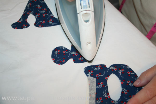 Carefully remove the masking tape. Set the iron to the temperature recommended on the package and fuse the letters in place.