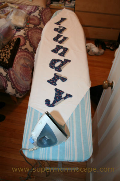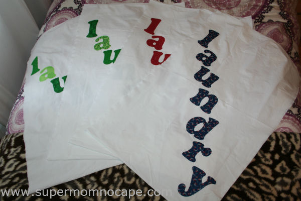 Here are my four laundry bags; letters fused and ready to sew together.