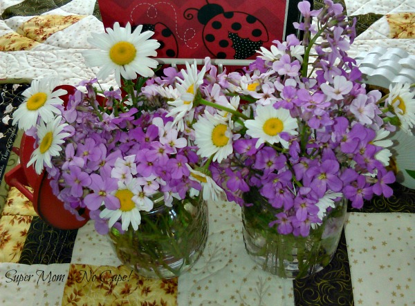 Sometimes on the way back from the farm where we buy our eggs, we’ll stop and pick some wildflowers that are growing in the ditch beside the road.  In keeping with their rustic origins, when I get them home, I like to arrange them in mason jar vases.