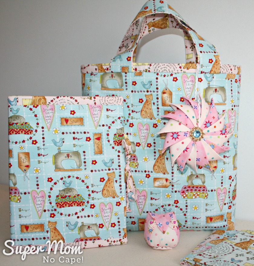 I spent several days making this beautiful prize package of a tote with matching journal cover, Prairie Point Star Ornament and Owl Pincushion who we named Artemis.